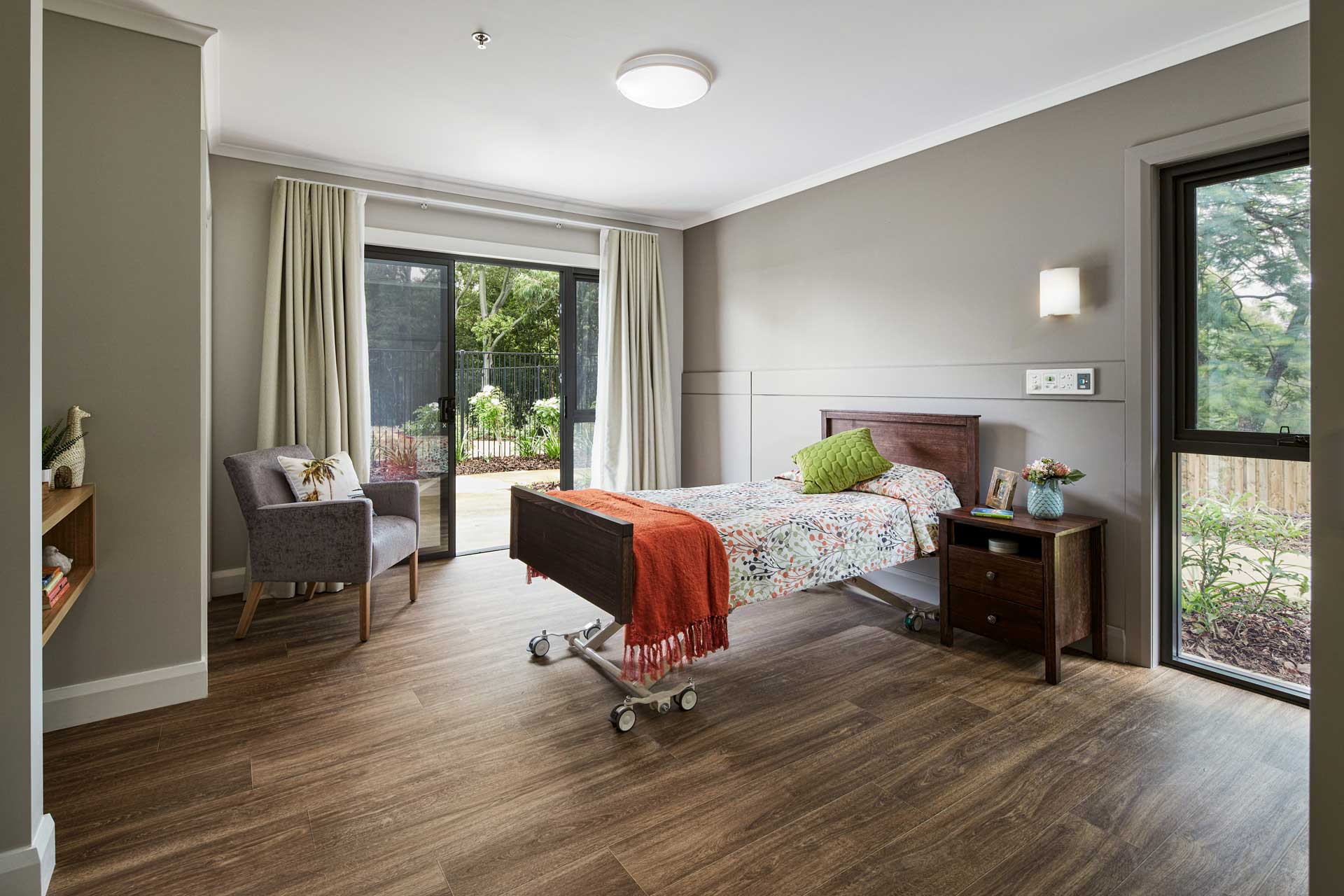 24/7 nurse call system with call points in bedroom and bathroom, so you have the comfort of knowing staff are available when you need them